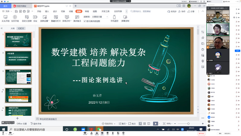孙玉芹教授向学院师生介绍了大学生数学建模竞赛在课程思政育人方面的重要作用,详细地讲授了一个与图论相关的数学建模案例,并就图论在电网络方面的应用与学院师生进行了交流与互动。